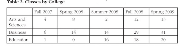 The embedded librarian program at Athens State was originally spearheaded by the library director, who serves as liaison with the College of Arts and Sciences, and the reference librarian who is liaison to the College of Business. These disciplines are reflected in the use of the program during the first two semesters (see Table 2). The College of Business has a library component in the required Organizational Communication class, and the embedded librarian was quickly added to all sections of that class. The sudden expansion of the program into the College of Education in the summer of 2008 occurred when a similar library component was added to the required Foundations of Education class.