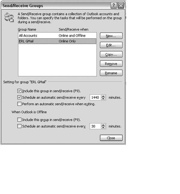 Some issues became apparent as soon as the transfer process began. The most problematic is a significant slowdown in performance of the Outlook client. The cause appears to be in Outlook’s automated send/receive process; the slowdown occurs while this process is running. The solution involves creating a “Send/Receive Group” for the Google Mail account only. The automatic send/receive can then be set to run only once a day for this group, which is acceptable for an archive where little or no e-mail traffic is expected.