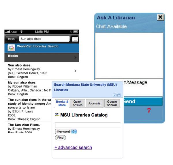 The embedded, widgetized library is nothing new; there are iPhone library and catalog applications, vendor-created chat widgets, and iGoogle gadgets galore. Montana State University library users can drop an iGoogle gadget into their iGoogle homepages that provides quick access to “Books & More,” “Quick Articles,” their “Journalist,” and “Google Scholar” in a tabbed interface. Reference librarians who use OCLC’s QuestionPoint can embed a Qwidget, a chat widget, easily into library Web pages. iPhone and iPod Touch users have libraries around the world in their pockets and purses with the WorldCat Local app.