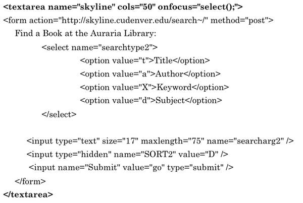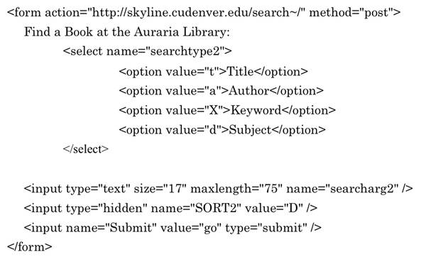 In technical terms, at the simplest level, any library search box or fill-able box on a Web page is an HTML form. While writing form code from scratch is beyond basic HTML knowledge, copying and reusing existing form code is as easy as Ctrl + C and Ctrl + V (or Cmd + C and Cmd + V for Mac users). Consider the basic code for the Auraria Library Skyline catalog’s search box: