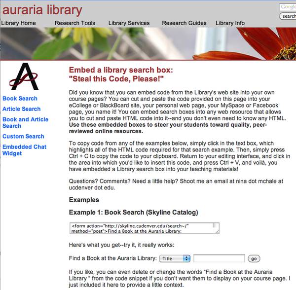 Keep the copy-and-paste process simple, with easy-to-read directions, and make contact information for an appropriate person readily available. Further, consider demonstrating how to copy and paste the code successfully into your institution’s course management systems of choice at faculty outreach events. In fact, the iteration of the Auraria Library “Steal This Code!” page presented here came from a spring symposium conference presentation on the University of Colorado-Denver campus.