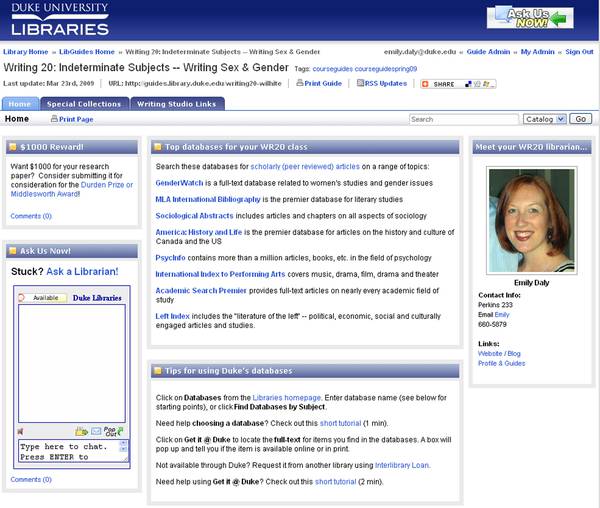 The task force disbanded in June 2009, but a representative has continued to market the Library Guides feature both to students and faculty and to provide support for these embedded librarians—librarians who have accepted the challenge to show up where Duke’s undergraduates are and when they need them.