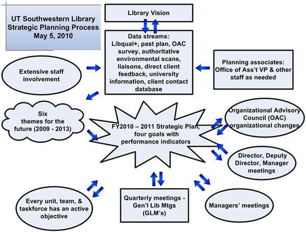 The strategic planning system that has been briefly described in this article did not evolve overnight. It developed over a number of years and was modified to accommodate emerging technologies and changing client and staff needs. It required a culture change for the UT Southwestern library staff.