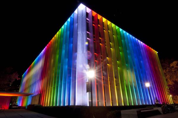 The lighting slowly changes throughout the night to enhance the library’s focal presence on campus. In addition, lighting designs have been created for celebratory campus events, such as graduation and homecoming as well as special holidays. The green technology behind the display uses color-changing LED bulbs that can mix to white light or create dynamic color combinations. The library’s aluminum structure serves as a canvas for painting with color and the designs create a sense of energy and activity at night.