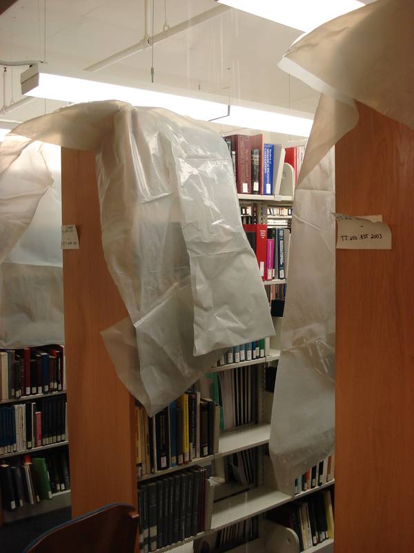 Remarkably students took this all in stride using library resources and study space oblivious to plastic sheeting on all the book shelves, fans and dehumidifiers throughout the building, and university personnel who were repairing the damage. S&T Library personnel retrieved and reviewed the books that were stored in the freezer and made decisions about further salvage efforts or discarding and replacing them.
