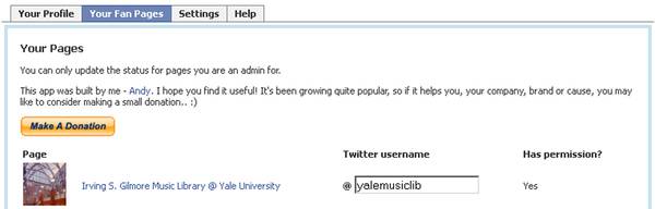 At this point, you are able to use Twitter and add the hashtag#fb to send your tweets to your Facebook Wall (e.g., Yale purchases Noah’s Ark at Sotheby’s auction #fb). The next step, however, is the most interesting because it will allow you to connect an RSS feed to your Twitter account which, in return, will push the feed items to your Facebook Fan Page Wall; any RSS feed should work. For example, the Yale Library OPAC, Orbis, has an RSS tool that runs a search for newly cataloged items and that can be limited to certain parameters (e.g., only music items). That way, newly catalog books, CDs, and DVDs will be pushed to that RSS feed, then to Twitter, and ultimately to Facebook. All of this while you are sitting back and enjoying.