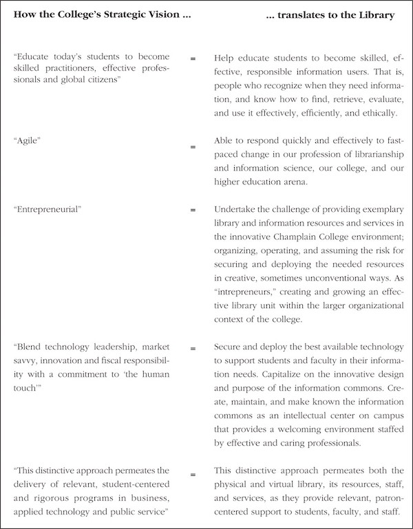 An extreme example of this occurred some years ago when I was asked to write a statement applying the college’s institutional mission to the library. At that time the library’s mission fell loosely into the “support the academic mission of the college” category—a lack of detail that was inappropriate for the task at hand. The institutional-level statement, on the other hand, articulated many factors that make Champlain College unique, and provided plenty of clues for library alignment.6 As I expressed it then, “the challenge was to determine how this vision can best inform the planning and operation of the library. The most expedient approach seemed to be to translate—literally—the college’s vision statement by capturing the intent and spirit of it in terms that can be realized in the context of the library.”7 Figure 1 shows the process of “translating” the institutional statement phrase by phrase into language that was relevant for the library.