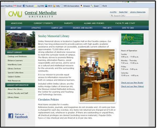 Central Methodist University (CMU) is a small liberal arts college in rural Missouri, with around 1,200 students enrolled on the traditional campus, with another 1,500 or so enrolled in online and distance education courses. As our enrollment shifts from face-to-face contact with students to a virtual environment, the library is continually seeking ways to reach out not only to the on-campus faculty and students, but also to the nontraditional learners, in an accessible and appealing way. One of the most recent attempts has been through the social media tool Pinterest.