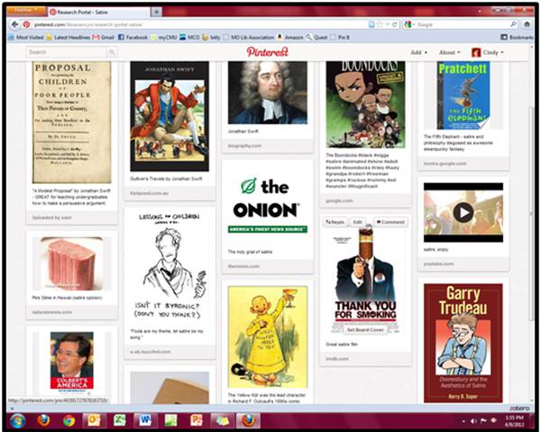 Students create a Pinterest account and are asked to select images that related to the term satire. Each student is responsible for his or her own pinboard, and is asked to share the board via the course management software. Because a term like satire has a broad definition and can be interpreted differently by different people, this topic was a perfect test run for the application. Students gather images from a huge range of sources, from Jonathan Swift to The Colbert Report.
