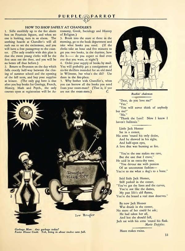 The Purple Parrot shows students what was funny at NU in the 1920s, 1930s, and so on—and generally what was funny for their demographic, as some of the content included in the Parrot is syndicated College Humor material.
