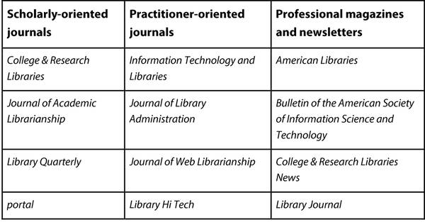 Research topics can also be identified through engagement with the discourse in the library community and beyond. Talking with library colleagues about trends and new developments can be helpful, as can talking with faculty and students at a nearby school of library and information science or iSchool. Reading the professional and scholarly library literature in journals that provide broad coverage of library topics and those that focus on your particular areas of interest, as well as attending library conferences, will keep you engaged with the topics receiving the most attention currently, and may reveal ways to contribute to the discourse.