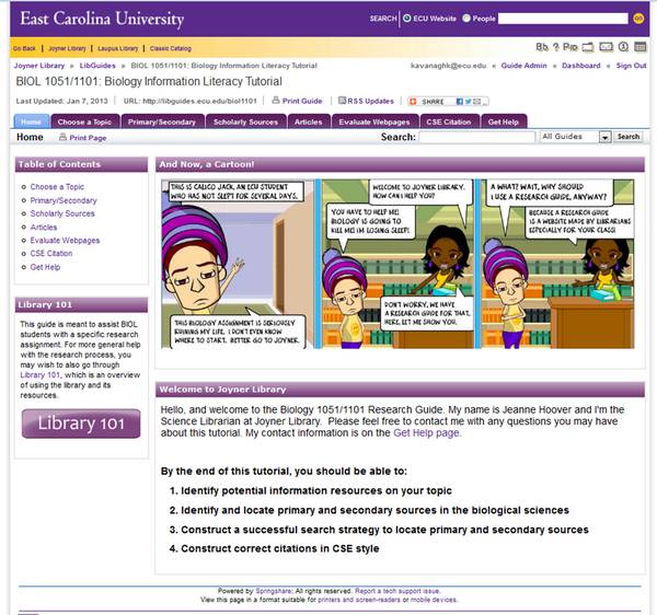As part of my job orientation, I attended a week-long workshop called Teaching with Technology through ECU’s Office for Faculty Excellence. In one presentation, a group mentor for the instructional session suggested the use of a cartooning software called ToonDoo for creating an avatar to post in Blackboard. I created an account on the free online site while he was talking and began fiddling with the software in the free moments we were provided during our break time. This gave me an idea. What if cartoons could be one way for me to break up some of the text in Joyner Library’s LibGuides, and breathe a little life into them?