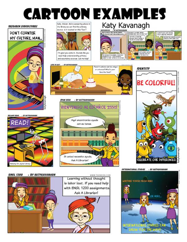 I now can create a cartoon in around 15 minutes. The cartoons are simple to produce, and since the software is Web-based, I can do it on the reference desk or in my office. I even wrote the cartoons into my goals for the year, so the administration knew of their existence. When introducing the new Graduate 101 library skills tutorial for graduate students to assembled faculty and staff in a meeting, I got as many questions about the comic strips as I did about the content.
