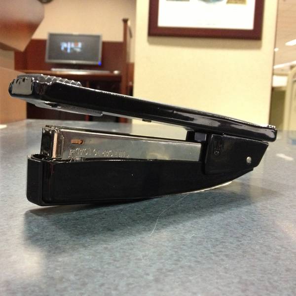 The average life span for a stapler at my library’s reference desk this past semester was 15.3 days. The most common cause of stapler death was exhaustion. An exhausted stapler would staple once, and then jam, entering a state of nonresponsive “stapler shock.” After a librarian valiantly unjammed it, the stapler would muster one more staple before collapsing again. Often we were not able to intervene before a frustrated student began assaulting the jammed stapler. One should not beat a dead stapler.1
