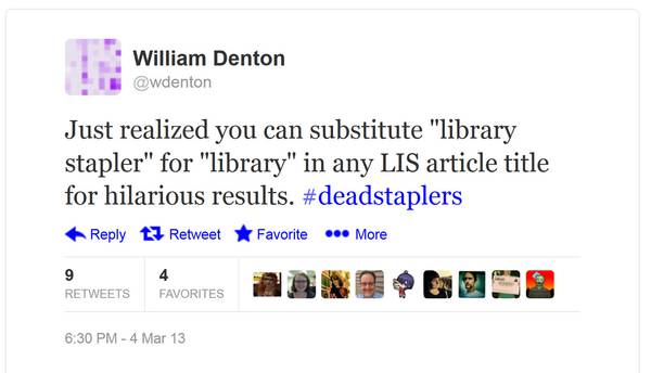 We can replace the word library with library stapler in our professional conversations and joke about the American Library Stapler Association. Or we imagine ourselves reading the latest issue of College & Research Library Staplers News. Or how about studying Ranganathan’s Five Laws of Library Stapler Science? The possibilities are endless.