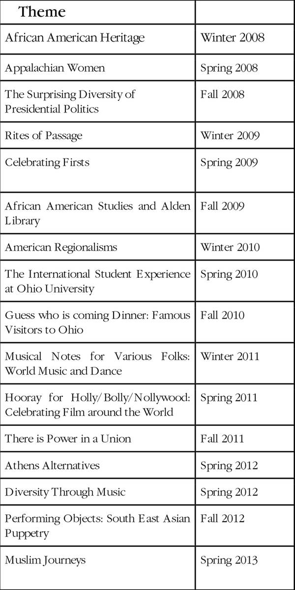 Academic library settings, being neutral spaces serving all students, provide unique opportunities to interact with members of a diverse community and to experience the challenges involved. To effectively serve the needs and demands of this community, specific skills, knowledge, and training are required to engage that community and cultivate an environment where differences are valued and respected. The Culture Showcase speaker series2 is the major activity of Ohio University Libraries Diversity Committee, serving to promote diversity awareness among the university community and the library staff, and supporting outreach to the university and larger Athens community. The committee, recognizing the pluralistic nature of the campus, uses the series as a vehicle for the acquisition of knowledge and understanding about the history, traditions, values, and artistic expressions of the campus community. The culture showcase speaker series consists of culturally stimulating events held at the library using local experts as speakers, as well as performances, music, dance, and film aimed at creating an inclusive environment and enhancing the academic experience of the university community.
