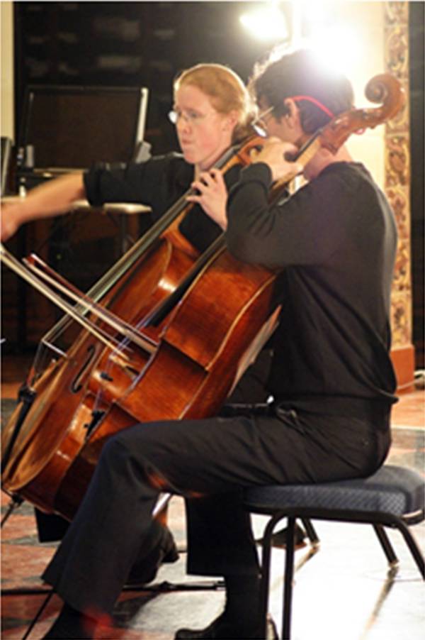 One of the important music pedagogies that take place in the Vivaldi concert and others, are students performing alongside their professors. The two photos on this page illustrate this concept. In the first, Viola Professor Richard O’Neill performs a Bach Brandenburg concerto with his freshman student. The other is from a series of concerts featuring the Bach cello suites, with the graduate student on the left, and Professor Antonio Lysy on the right.