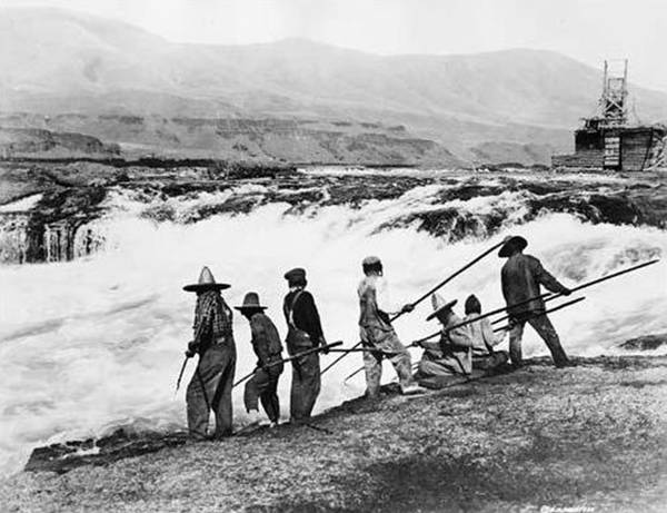 After things dried out, Native American tribes arrived. Most made their lives by fishing, particularly for salmon and, for some tribes, lamprey eels. One of the best fishing spots was Celilo Falls (about 30 miles east of Portland), where the Columbia River, which follows the path of the Bretz Flood, went through a lava flow creating narrow channels through which the fish could be caught in nets or speared. It was a major meeting and trading place for native peoples, who developed great skills as basketmakers. A trade language called the “Chinook jargon” was developed there. Chinook is also the name of one of the tribes, and the largest of several salmon species. (Although local fishermen call them “Kings.”)