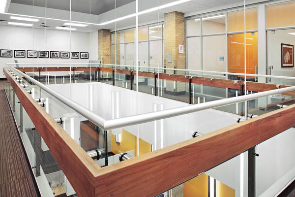The second floor of the updated facility features a large opening in the floor, which creates the library’s atrium. The library’s new study group and conference rooms are enclosed with modular Steelcase glass wall systems to eliminate a noise impact while providing the feeling of an open space and inclusion. Conference rooms are equipped with interactive white boards as well as video conferencing and remote learning capabilities. Work on the renovated library was performed by Stalco Construction and Ehasz Giacalone Architects.
