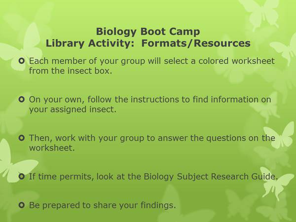 At the beginning of the session, we divided the class of 24 students into groups of three and each group received one insect kit. We then explained the directions for the activity. Each member of the group was to select a colored worksheet from their assigned insect box and follow the instructions to find information on the assigned insect. Using the worksheet, the members of the group then worked together to answer the questions on the usefulness and limitations of the resources they used. The questions included: 1) Which resource provided an overview of your insect? 2) Which resource provided the most current, up-to-date information on your insect? 3) Which resource provided the most in-depth information on your insect? and 4) Which resource had the narrowest focus in terms of information on your insect? (If students finished the activity early, they were directed to examine the Biology Subject Research Guide.)