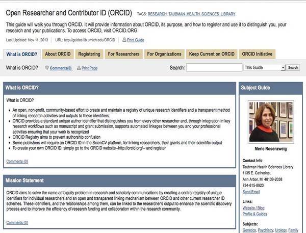 Subsequently, a librarian who is a member of the task force created an online guide to facilitate disseminating the specifics for managing ORCID.13 This guide was later incorporated into a poster displayed at the Michigan Health Sciences Libraries Association 2013 Conference in Grand Rapids, Michigan; the 2014 Medical Library Association Conference in Chicago; and the 2014 ORCID Ambassadors’ Meeting in Chicago.
