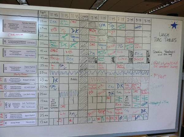 One consistent piece of feedback that we have not yet resolved involves the method of signing up for treatments. We have opted to have faculty sign up for their treatments on a large whiteboard on the day of the workshop, after they’ve heard introductions from all the consultants. We’ve chosen this method because it doesn’t involve training anyone how to use software, doesn’t require that everyone have a computer, encourages faculty to listen to all the consultants introductions and then decide their interest areas, and avoids the issue of someone signing up for many appointments in advance, only to change plans on the day of the spa.