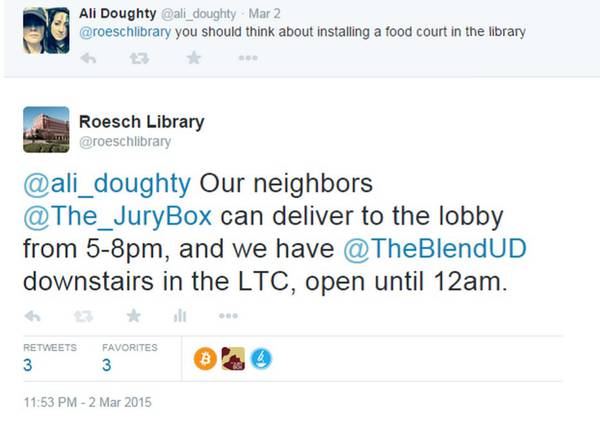 At the University of Dayton (UD) Libraries, our public services areas use notification tools and Twitter’s search feature to observe what students write about the library and to engage with them on a daily basis. Established in 2009, the Roesch Library Twitter account (@roeschlibrary) started as a way to announce events and services. Beginning in 2010, the newly hired communications and outreach librarian began tracking tweets that referred to the library, organized them in a spreadsheet, and began categorizing them. Similar to many named buildings, students refer to Roesch Library, as Club Roesch, and use a hashtag (#clubroesch). #clubroesch is one of our saved searches that we check frequently. A term that was created by our students, the idea of the library as a club appealed to them, especially when students are in the library late at night or over the weekend. Monitoring Twitter chatter provides an opportunity to improve services by knowing what students criticize (slow Wi-Fi in the building, loud students on quiet floors, etc.), and it also informs us that the library is viewed as a popular place on campus.