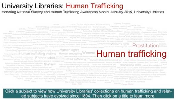 The interactivity embedded in this visualization may be fully experienced at http://go.osu.edu/OSUL_HumanTraffickingAwareness. Click on a subject of interest in the word cloud, such as Women’s Rights. A hidden table will appear with a list of titles related to that subject. Then click on a title to directly link to the libraries’ catalog record to learn more. |