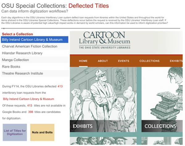 The resulting visualization combines narrative with collection filters (Figure 2). The narrative provides context by explaining the basic premise, or why the dashboard was created: to determine whether data can inform digitization priorities. The collection filters allow users to view data concerning each individual collection in isolation. Thus if you select the Billy Ireland Cartoon Library & Museum, only the data regarding this collection will appear in the paragraph below the filter.