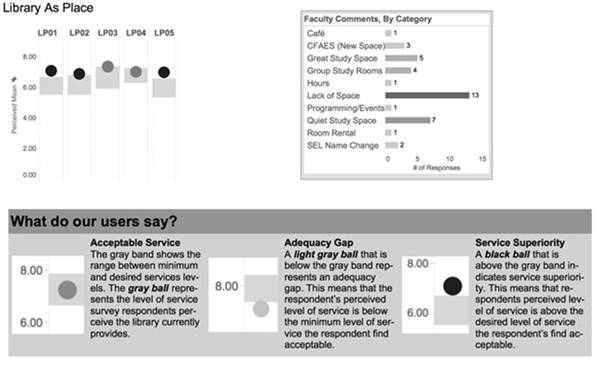 The static visualization in Figure 3 presents one of these alternative visualizations. This visualization provides a summary of faculty quantitative and qualitative responses in the Library as Place LibQUAL dimension and is currently included in an internally shared executive summary.6 The gray rectangular bands indicate the range between respondents’ minimum and desired level of service. A black, gray, or light gray ball represents the respondents perceived level of service. University Libraries desires a black or gray ball, as this reflects that a respondent’s satisfaction with library resources and services is either within respondents’ zone of tolerance (acceptable service) or exceeds their desired level of service (service superiority). A light gray ball indicates a service adequacy gap. This means that survey respondents perceive that the resources and services the library provides are below their minimum expectations. The black balls are colored green in the locally shared executive summary, the gray balls are colored blue, and the light gray balls are colored red. This visually draws managers’ attention to areas where library users identified an adequacy or a superiority gap.