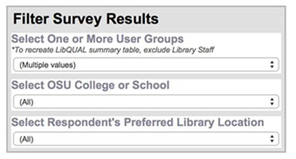 University Libraries, however, serves an extremely diverse user population with often competing library needs. To allow librarians and staff to further drill down into the data, two similar, yet interactive visualizations of the same survey results were also created. The first presents the 2015 results in isolation, grouping questions by LibQUAL dimension, as in Figure 3. Filters, however, are incorporated into the visualization and allow users to view the results by one or more user groups, an OSU college or school, or the library location or locations respondents indicated they used the most often (Figure 4). The gray bands and the ball color on the visualization will automatically recalculate and adjust when filters are reset and adjust. A business rule is also set so that filtered data only displays when there are more than ten survey responses.