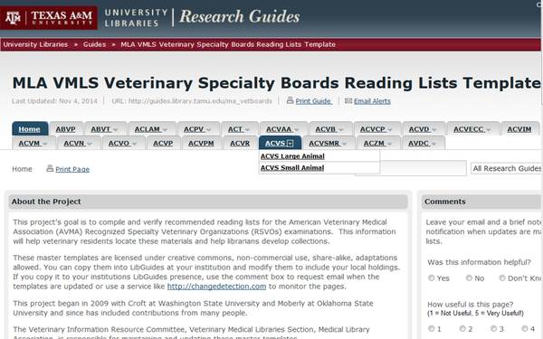 In LibGuides 1, separate subtemplates were created to help organize the larger reading lists in LibGuides 1. See Medical Library Association Veterinary Medical Libraries Section, “ABVP Template,” http://guides.library.tamu.edu/ma_vb_abvp; “ACVIM Template,” http://guides.library.tamu.edu/ma_vb_acvim; “ACVP Template,” http://guides.library.tamu.edu/ma_vb_acvp; “ACVPM Template,” http://guides.library.tamu.edu/ma_vb_acvpm. |