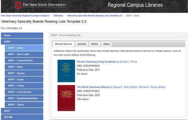 The master template is the centralized LibGuides switchboard for navigating to the appropriate specialty board list. There are master templates for both for LibGuides 1 and for LibGuides 2. See Medical Library Association Veterinary Medical Libraries Section, “MLA VMLS Veterinary Specialty Boards Reading Lists Template,” http://guides.library.tamu.edu/ma_vet-boards. “Veterinary Specialty Boards Reading Lists Template 2.0,” http://osu.campusguides.com/VetBoardLists. |