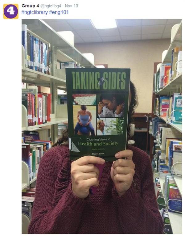 The “hashtag hunt,” or Twitter-based scavenger hunt, is an activity that any librarian can complete with his or her students. Though it was originally created to help English 101 students practice finding recommended books for research assignments concerning controversial or moral issues and with the OPAC, it also allows students to explore the library as a place. The handout students receive is structured like all of the traditional library scavenger hunts of day’s past, but students are asked to take photos of the items they find and post them on Twitter with hashtags of the librarian’s choosing, usually hashtags that distinguish the library and the class (e.g., #hgtclibrary and #eng101). Students may also be awarded bonus points for #shelfie posts, which are explained to be posts of themselves in stacks, using the one of the collaborative learning units and/or print stations, or standing in a study room. Tell them that creativity counts. This usually inspires fun photos full of smiling faces. It is important to note that the parameters of this activity can be modified to fit any library, librarian, group of students, and assignment.