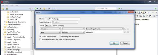 Even though collection development has become a smaller part of my liaison work, Zotero helps me make more informed selections of library materials, and I am able to promote those resources and other library services in a tailored way, rather than just as an email blast to an entire department. I can also easily make connections between faculty across my departments by using Zotero’s search feature. I have several saved search folders on interdisciplinary topics (gender, media, film, pedagogy, etc.) that automatically collect all of the profiles of the faculty interested in those topics. In this scholarly era, where interdisciplinary research is prized, I want the library to be a place where those connections can be both created and fostered.