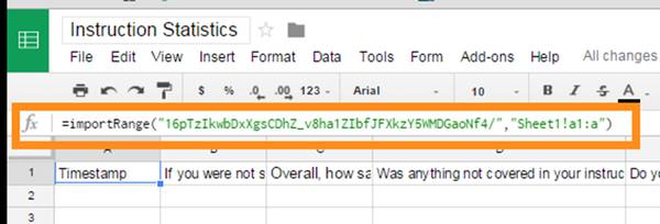 Next, we created a new Google Sheet that will serve as our master collection of statistics (we named it “instruction statistics”). Inside that new instruction statistics sheet, we designated the first spreadsheet (spreadsheets appear as tab along the bottom of the page) as our instruction report, while other spreadsheets would be used to hold data imported from the Google Forms.