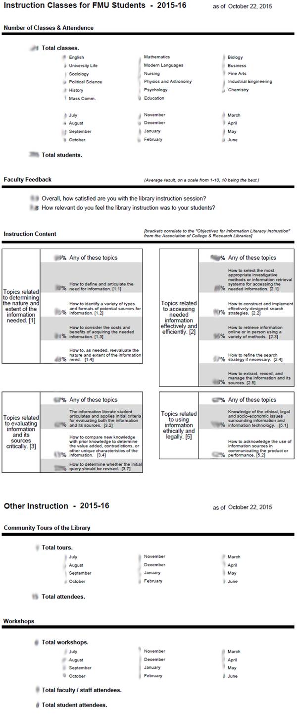 This introduced two new sources of instruction data (a professor assessment form and a librarian report) in addition to the attendance records we were already dealing with. We set out to find a way to automatically collect all of the instruction data into one report that would serve as an up-to-the-minute summary of our instruction.