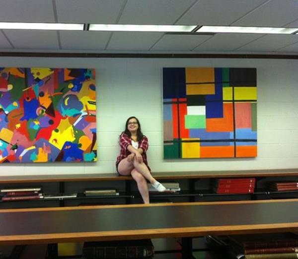 In one instance, I worked closely with Toni Eisman, a sophomore from the Rutgers Mason Gross School of Visual Arts (MGVA) for her untitled exhibition of paintings. As this was her first solo exhibition, she had no prior experience in preparing the required documents, and also needed physical assistance in helping hang her paintings (see figure 3). Eisman showing her work in the Art Library, introduced many MGVA students to RALES, which has inspired further connections between the students and myself, as well as built stronger ties between the Art Library and the students we serve.