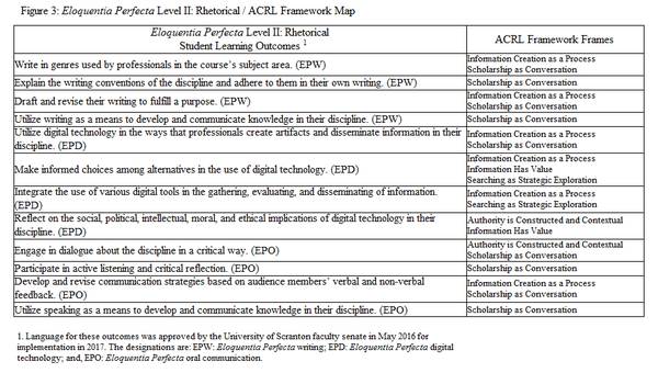 A central component in the rearticulated GE curriculum to both to the GE program as a whole and to information literacy specifically is the Eloquentia Perfecta component. Latin for “perfect eloquence,” Eloquentia Perfecta is a Jesuit pedagogical goal that “aims to develop students’ abilities to generate topics of inquiry; to gather, evaluate, and disseminate information and ideas; and to communicate in varied modes within appropriate contexts and disciplines, so that they are empowered to excel as professionals and citizens to serve more fully the common good.”8 This GE component houses the skills-based courses required of every student at the university: writing, oral communication, digital technology, and on the foundational level, first-year seminar. Based on the mission of Eloquentia Perfecta and the courses included in its requirements, it was clear to us in the library that this part of the curriculum was ripe for information literacy intervention. But curricular development is never linear, and the relationship between Eloquentia Perfecta, the Framework, and the Weinberg Memorial Library’s information literacy program is both rich and complex, emerging iteratively over time.